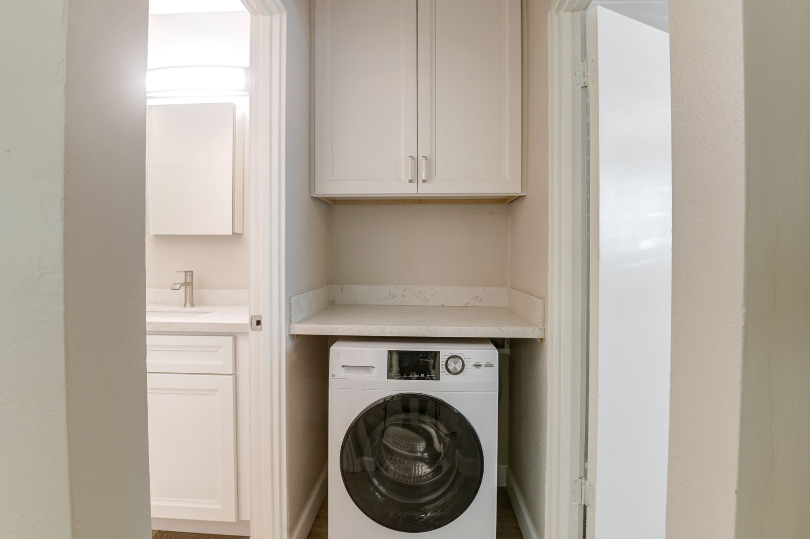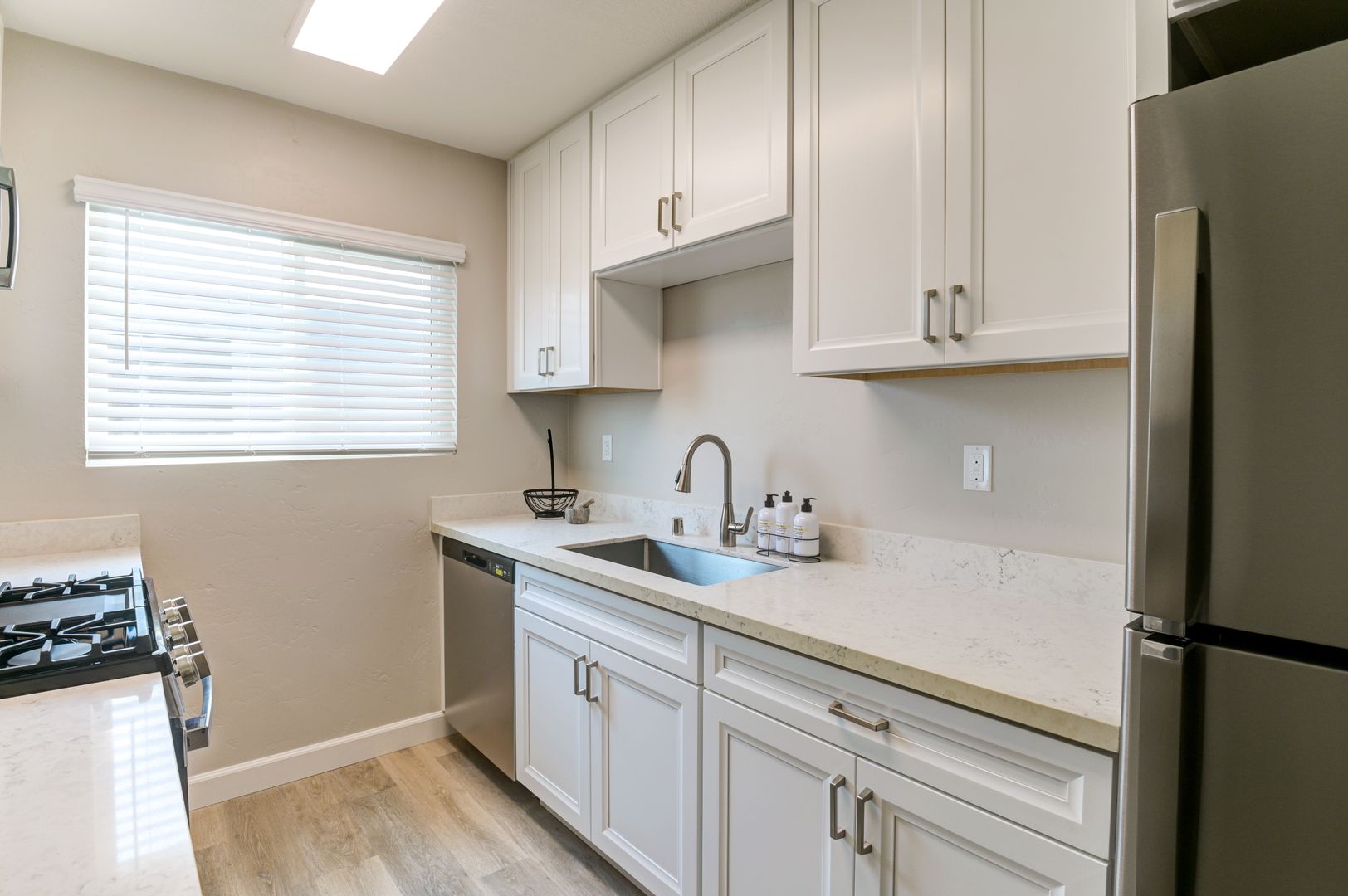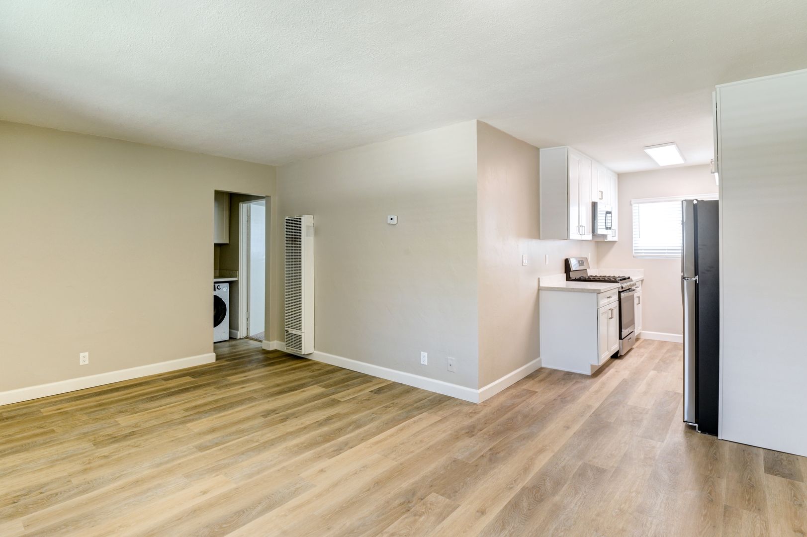 Welcome to The Quincy, located in the heart of Poway! Our renovated apartments feature modern interior finishes such as stainless-steel gas appliances, luxury plank flooring, tiled showers, quartz countertops, oversized mirrored closets, and an open-concept floor plan. Apartment #5 is a downstairs back south-facing unit featuring A/C to keep you cool, high-efficiency in-unit laundry, and one assigned parking space.